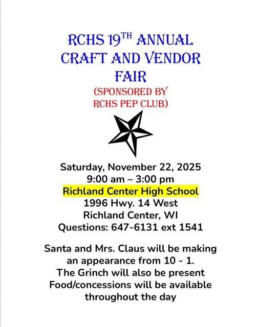 Join the RCHS Pep Club at their annual Holiday Arts and Craft Sale in the Richland Center High School Gymnasium, Saturday, November 22, 9:00am to 3:00pm. This is a huge area craft sale with a long history of providing excellent holiday arts and crafts, food and concessions, and even a little entertainment along the way.