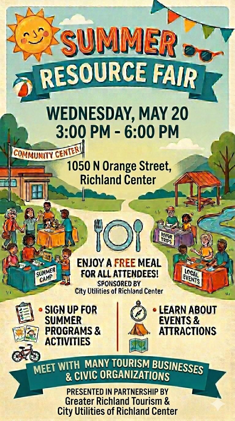 You can sign up for City Recreation programs, explore summer reading at the Brewer Library, and connect with premier local destinations like English Prairie Distillery, Driftless Music Gardens, and 13 Pines RC. Beyond the fun, you’ll find essential community connections with organizations like the Symons Recreation Complex, 4-H, the ADRC, and Passages. Most importantly, this event is a true county-wide celebration: all Richland County residents are invited to join us for food, fellowship, and a head start on a great summer!