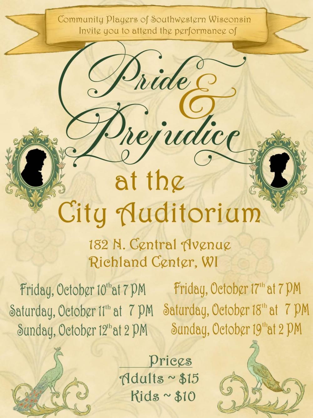 In celebration of Jane Austen’s 250th Birthday this December, Community Players of Southwest Wisconsin proudly presents her beloved classic, Pride and Prejudice, this October at the City Auditorium!