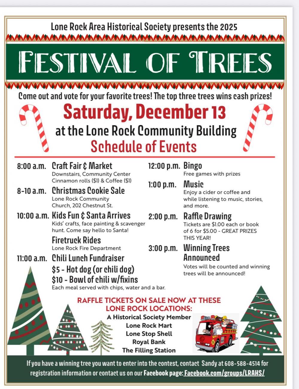 Join the Lone Rock Historical Society for their Festival of Trees, Saturday, December 13. The Festival of Trees is a full-day event including tree decorating contest, firetruck rides, Santa, a chili dinner, and a vendor fair. See more details at the image here.