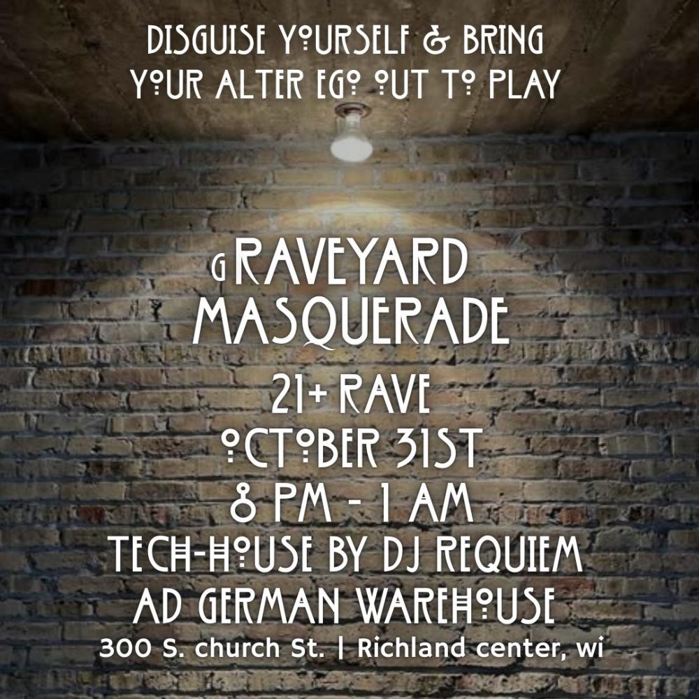 We invite you to disguise yourself and bring your alter ego out to play at the RAVEYARD MASQUERADE, an AD German Warehouse Production. Don your most creative costume and mask for a night of thrills and chills. Join us at the hauntingly beautiful AD German Warehouse for a Halloween celebration like no other. Let's dance the night away entranced in music and lights. Don't miss out on this unforgettable evening!