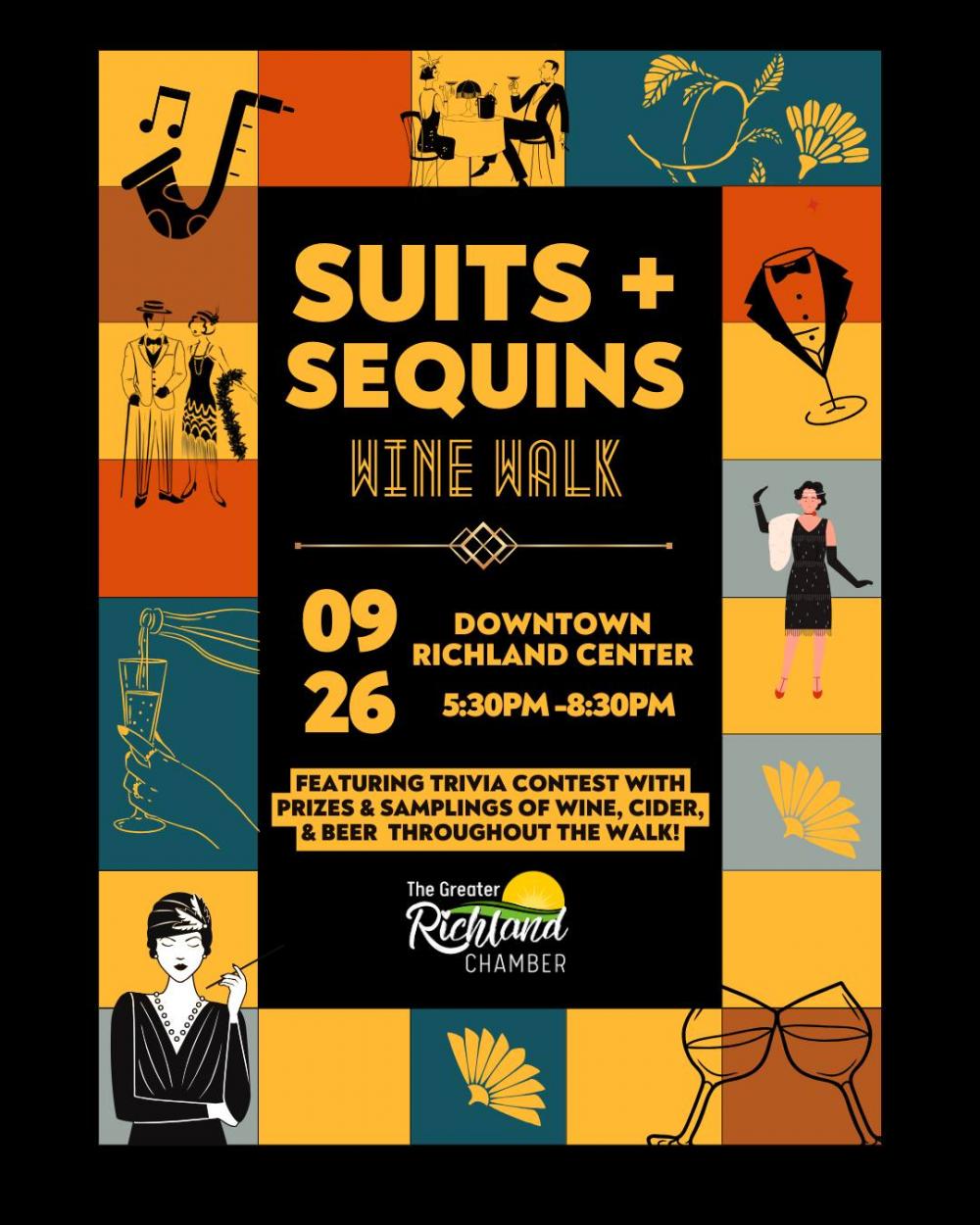 The Greater Richland Area Chamber of Commerce invites you to dress up for the Fall 2025 Wine Walk downtown on Friday, September 26. Grab your top hat or sequins and stop at participating businesses from 5:30-8:00 p.m. - Enjoy some of our favorite local wine, beer, and cider at various downtown businesses. Tickets are still available online and at local businesses. Creative Layers, Advance Pump and Well, JJ Walsh Jewelry, Christy’s Sunnyside, Community First Bank. More details and tickets are available by clicking on this link.